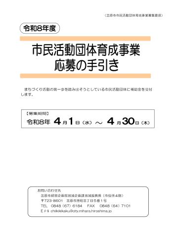 公開日:2026年04月01日助成金情報令和8年度市民活動団体育成事業補助金の申請団体を募集しますまちづくり活動の第一歩を踏み出そうとしている市民活動団体に補助金を交付します。