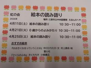 イベント公開日:2026年04月01日絵本の読み語り(4月)開催日:毎月第2・第4土曜日