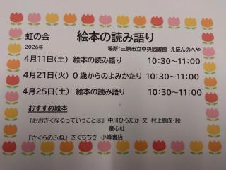 乳幼児を対象とした絵本の読み語りと、わらべ歌遊びや手遊びなどをおこないます。
