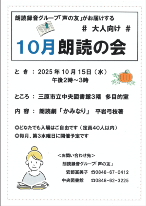 令和7年10月15日(水曜日) 中央図書館にて、朗読の会を開催しました! 平岩弓枝 著『かみなり...