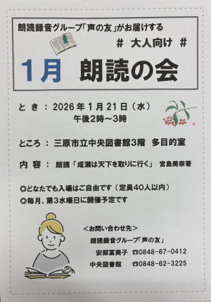 令和8年1月21日(水曜日) 中央図書館にて、朗読の会を開催しました! 宮島 未奈著『成瀬は天下...