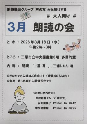 令和8年3月18日(水曜日) 中央図書館にて、朗読の会を開催しました! 三浦しおん 著『遺言』を...